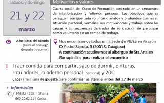El próximo fin de semana, 21 y 22 de marzo, vuelve el Curso de Formación de Voluntariado Internacional en la delegación de Aragón con la celebración del cuarto encuentro de formación bajo el título "Motivación [...]